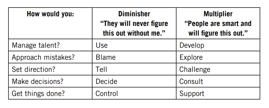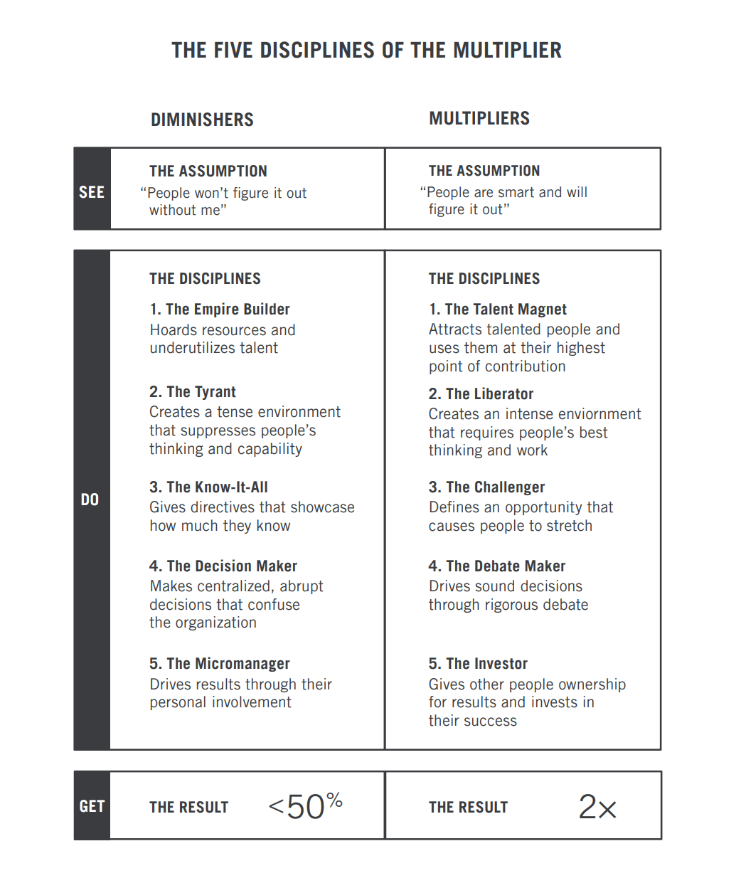 Multipliers are “genius makers who bring out the intelligence in others. They build collective, viral intelligence in organizations”.